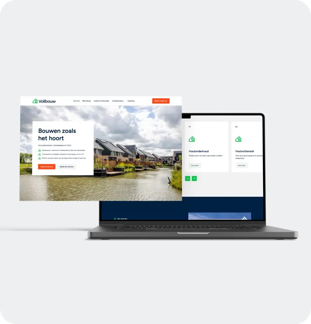 Heldere copy en slimme UX begeleiden bezoekers naar contact of offerteaanvraag. Ook in alle campagnes laten we zien waar Vollbouw voor staat: échte vakmensen, duidelijke communicatie en Volendamse degelijkheid.